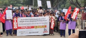 ಮುನಿರಾಬಾದ್ ಬಸ್ ಸಮಸ್ಯೆ ಪರಿಹರಿಸಲು ಎಐಡಿಎಸ್ಓ ನೇತೃತ್ವದಲ್ಲಿ ವಿದ್ಯಾರ್ಥಿಗಳ ಪ್ರತಿಭಟನೆ.