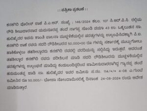 ಕನಕಗಿರಿ ಪೊಲೀಸ್ ಠಾಣೆ ಪಿ.ಎ.ಆರ್. ಸಂಖ್ಯೆ : 146/2024 ಕಲಂ. 107 ಸಿ.ಆರ್.ಪಿ.ಸಿ. ರಲ್ಲಿಯ ರೌಡಿ ಶೀಟುದಾರನಾದ ಯಮನೂರಪ್ಪ ತಂದೆ ನಾಗಪ್ಪ ಸೊಂಡಿ ಸಾ: ಹುಲಿಹೈದರ ಶಾಂತಿ ಪಾಲನಾ ಮುಚ್ಚಳಿಕೆಯಲ್ಲಿನ ಷರತ್ತುಗಳನ್ನು ಉಲ್ಲಂಘಿಸಿದಕ್ಕಾಗಿ ಪಿ.ಐ. ಕನಕಗಿರಿ ಠಾಣೆ ರವರು ಸದರಿ ರೌಡಿಶೀಟರನ 50,000=00 ರೂ ಗಳನ್ನು ಸರ್ಕಾರಕ್ಕೆ ಮುಟ್ಟುಗೋಲು ಹಾಕಿಕೊಳ್ಳಲು ತಹಶೀಲ್ದಾರರು ಕನಕಗಿರಿ ರವರಲ್ಲಿ ವರದಿಯನ್ನು ಸಲ್ಲಿಸಿದ್ದಾರೆ. . ಅದರಂತೆ ತಹಶೀಲ್ದಾರ ಕನಕಗಿರಿ ರವರು ಪರೀಶಿಲನೆ ಮಾಡಿ ಸದರಿ ರೌಡಿಶೀಟರನು ಮುಚ್ಚಳಕಿಯಲ್ಲಿನ ಷರತ್ತುಗಳನ್ನು ಉಲ್ಲಂಘನೆ ಮಾಡಿದ್ದು ಕಂಡುಬಂದಿದ್ದರಿಂದ ಜಾಮೀನುದಾರರಾಗಿದ್ದ ಗ್ಯಾನಪ್ಪ ತಂದೆ ಹನುಮಂತಪ್ಪ ಜಾಡಿ ಸಾ: ಹುಲಿಹೈದರ ಇವರ ಜಮೀನು ಸ.ನಂ. 114/*/ 4-08 ಎ.ಗುಂಟೆ ಜಮೀನಿನ ರೂ 50,000/- ಭೋಜಾ ನೋಂದಾಯಿಸಲಿಕ್ಕೆ ದಿನಾಂಕ 24-08-2024 ರಂದು ಆದೇಶಮಾ