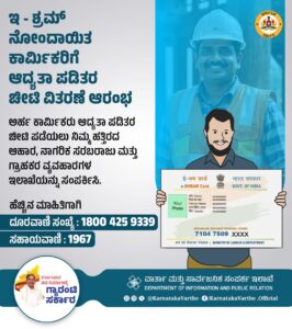 ಮಾನ್ಯ ಸರ್ವೋಚ್ಚ ನ್ಯಾಯಾಲಯವು ಇ-ಶ್ರಮ್ ನೋಂದಾಯಿತ ಕಾರ್ಮಿಕರಿಗೆ ಆದ್ಯತಾ ಪಡಿತರ ಚೀಟಿ (ಬಿ.ಪಿ.ಎಲ್) ನೀಡಲು ಆದೇಶಿಸಿದ್ದು, ಆದ್ಯತಾ ಪಡಿತರ ಚೀಟಿ ಹೊಂದಲು ಅರ್ಹ ಇ-ಶ್ರಮ್ ನೋಂದಾಯಿತ ಕಾರ್ಮಿಕರಿಗೆ ಆದ್ಯತಾ ಪಡಿತರ ಚೀಟಿ ನೀಡುವ ಕಾರ್ಯ ಕರ್ನಾಟಕ ರಾಜ್ಯದ ಎಲ್ಲಾ ಜಿಲ್ಲೆಗಳಲ್ಲಿ ಪ್ರಾರಂಭವಾಗಿರುತ್ತದೆ.